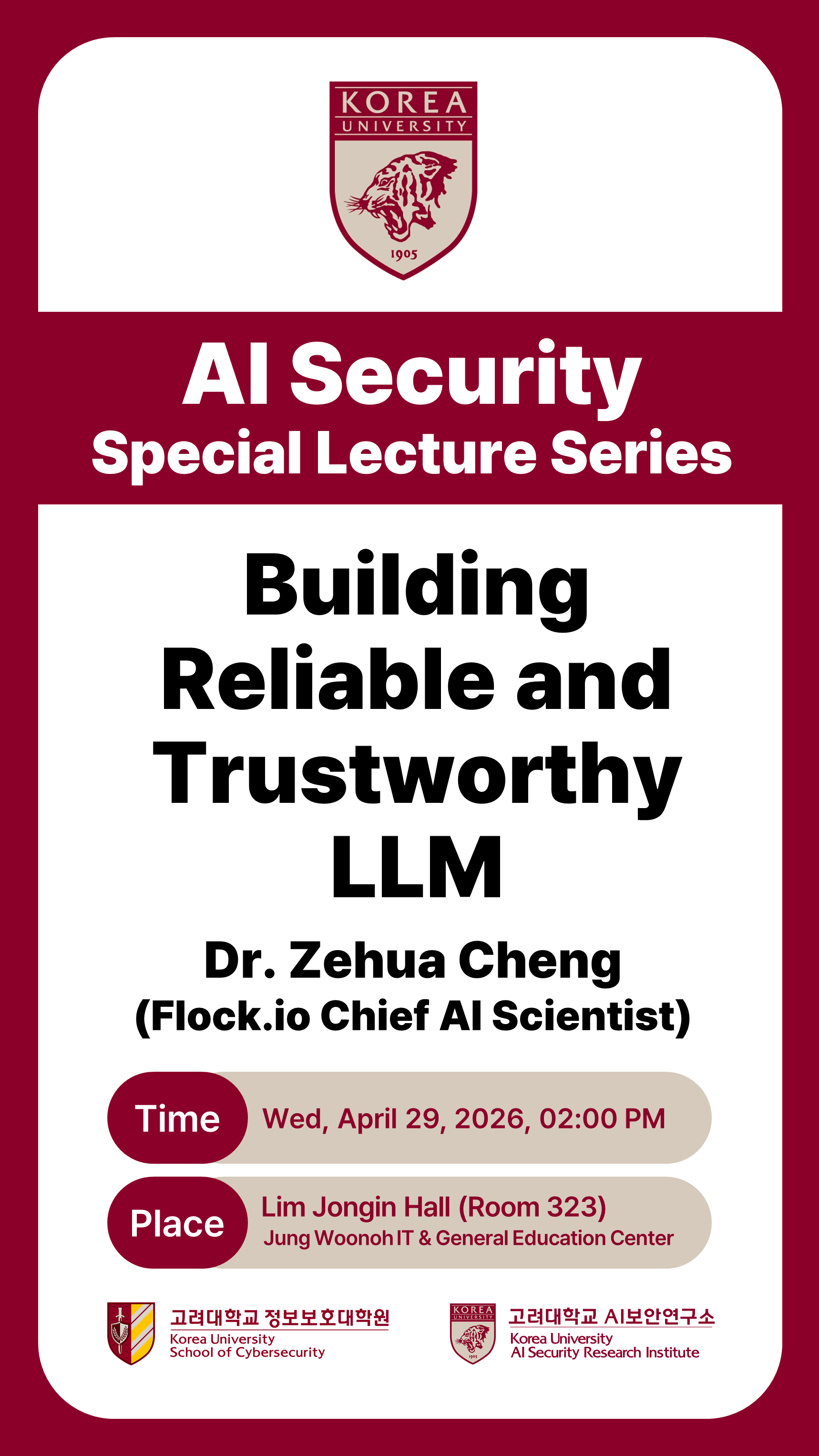 AI Security Special Lecture Series : Dr. Zehua Cheng (Flock.io Chief A… 정보보호대학원 2026-04-22 정보보호대학원 행사안내 0 2 4시간전