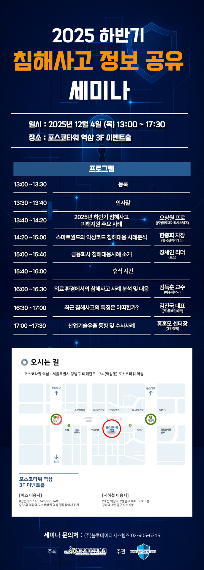 [홍보] 2025 하반기 침해사고 정보 공유 세미나 (2025.12.04) 정보보호대학원 2025-11-20 정보보호대학원 홍보 0 540 2025.11.20 13:21 사접접수 링크 : https://onoffmix.com/event/334275