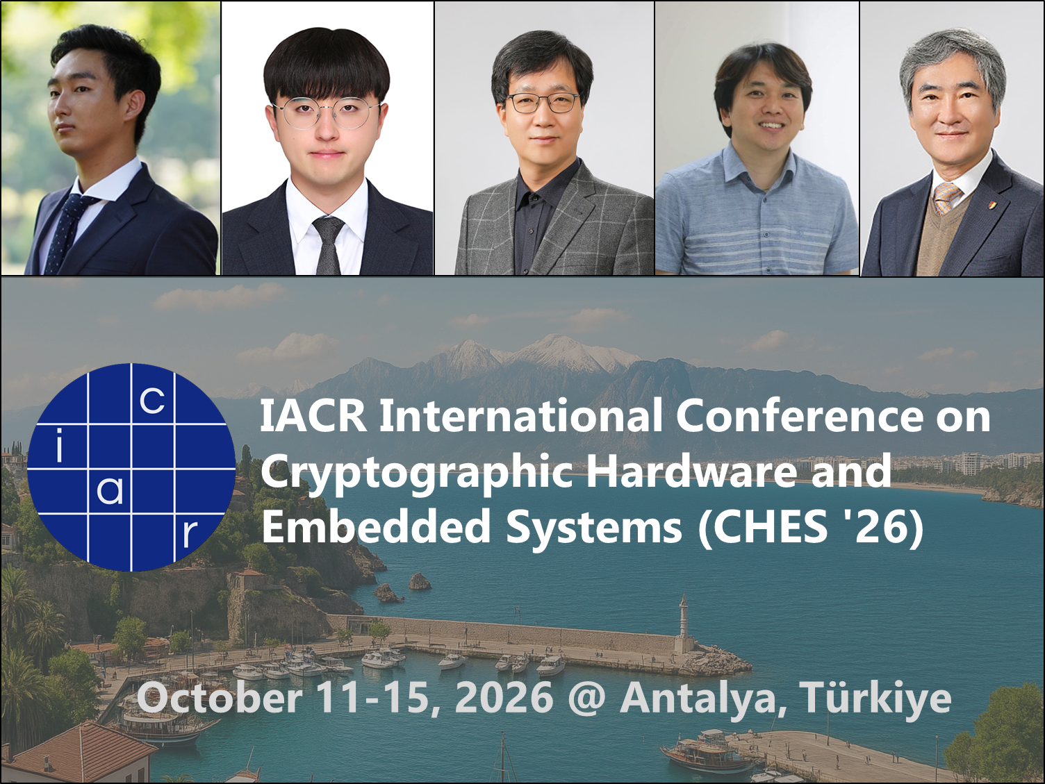 ○ 정보보호대학원 소속 김규상(석박통합) 학생과 신한범(박사과정) 학생 등의 논문이 암호 하드웨어 및 소프트웨어 구현의 설계와 분석 분야 세계 최고 권위 학회인 IACR CHES 2026 발표 논문으로 선정됨.